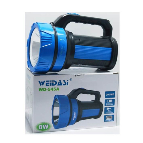 چراغ قوه شارژی 8 وات WEIDASI مدل WD-545A با طراحی زیبا، ساده و استاندارد یک ابزار کاربردی در بسیاری زمینه هاست. از این نورافکن برای کوهنوردی، کمپینگ، نگهبانی، باغبانی و …. استفاده می شود. همچنین در هنگام قطع برق در منازل و محل کار نیز این محصول کاربردی است. این چراغ نورافکن دارای یک لامپ در قسمت نور افکن به صورت LED می باشد. و دو لامپ نیز در بدنه آن تعبیه شده است. بواسطه سوئیچی که روی بدنه طراحی شده می توان چراغ را خاموش و روشن نمود. و از نوردهی آن را از حالت نورافکن به حالت فانوسی تغییر داد. این دستگاه با دوشاخه از طریق جریان برق اصلی شهر شارژ می شود. توجه داشته باشید که در حین شارژ دستگاه می بایست خاموش باشد.